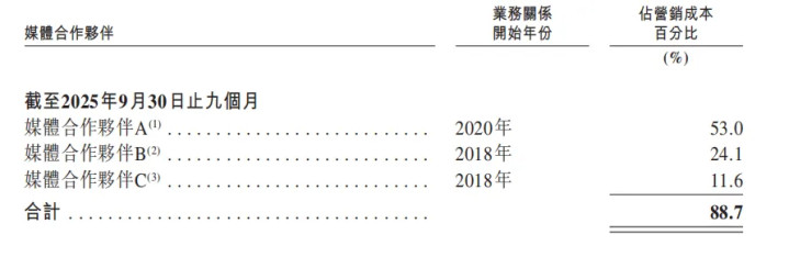 除了财务层面的压力,钛动科技的业务结构也暗藏风险。公司虽服务超10万家广告主,累计管理超过4亿个广告策略,并与Meta、Google、TikTok、Snap等全球领先媒体建立长期合作,但核心营销成本仍高度集中于前三大平台——招股书中的媒体合作伙伴A、B、C。截至2025年9月30 日,媒体合作伙伴A、B、C合计占营销成本的88.7%。